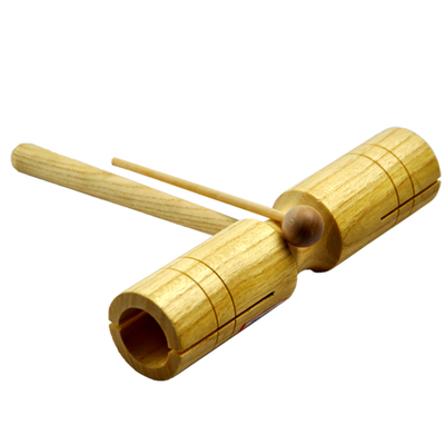 圓筒中間細(xì),兩頭粗。中間細(xì)的部分為實(shí)心,開(kāi)一圓孔,可以插入一根小棍,演奏時(shí)手持小棍,也可直接拿住中間實(shí)心部位,另一手持小木棍敲擊空心筒身部位發(fā)聲。